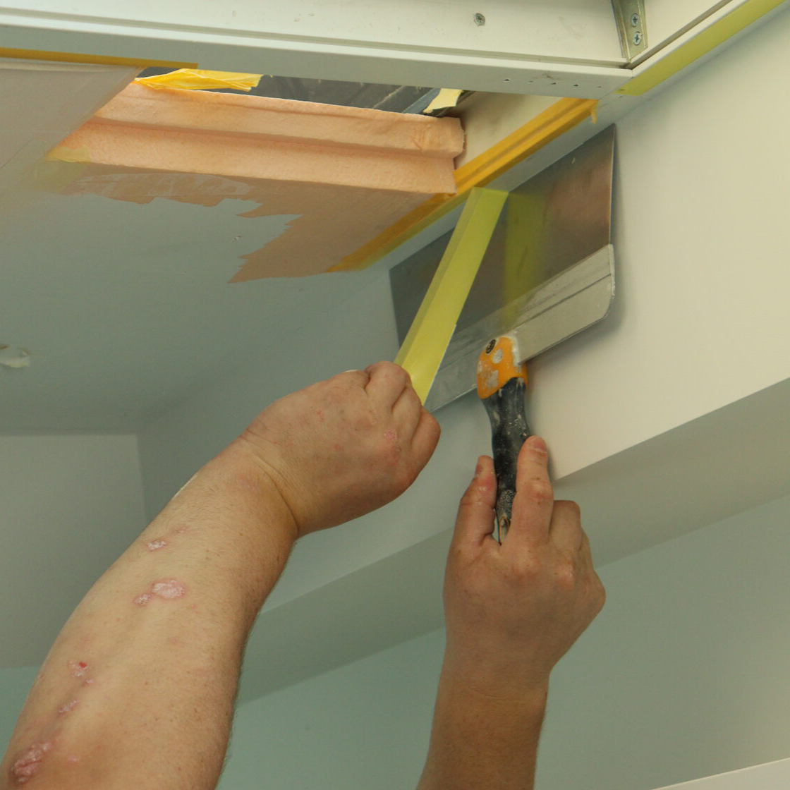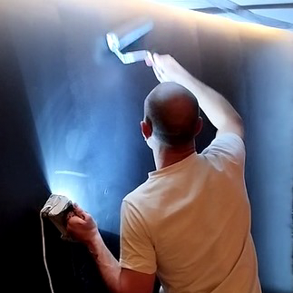 Если всю площадь эффективнее красить безвоздушкой, то здесь покраска валиком может быть более разумным решением, т.к. требует меньше упаковки (что удобно, если другие стены уже готовы, есть мебель), и дает более тонкий слой — значит, меньше расход краски.